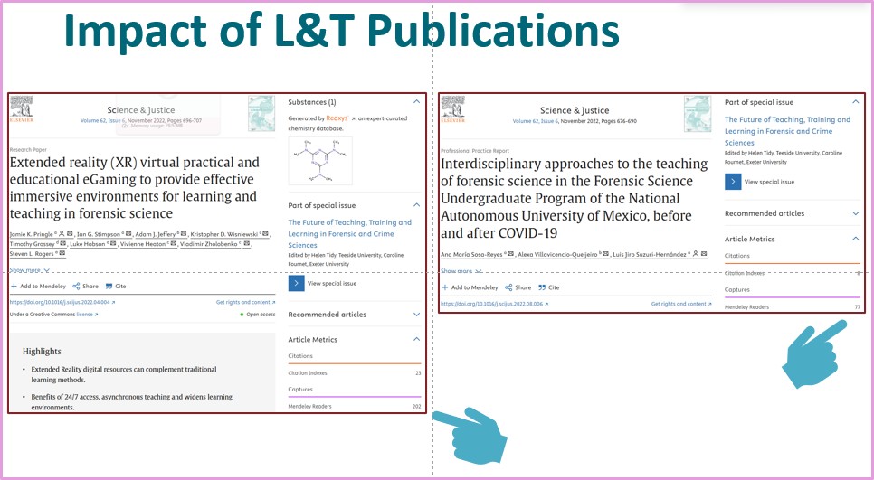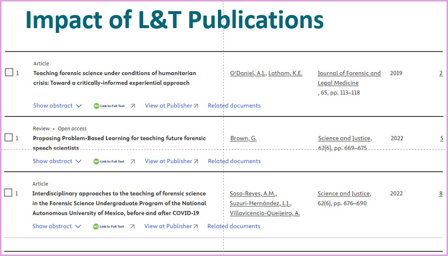 Back to the webinar. First of all, I wanted to set the scene a little for the audience. So I looked at the top 50 most cited publications in Science & Justice, Forensic Science International: Synergy, Journal of Forensic & Legal Medicine and the Journal of Forensic Sciences. I chose these four because I knew for sure that they had published L&T papers. Of the 200 papers in this collection, just one concerns learning and teaching. That one is Virtual reality for teaching and learning in crime scene investigation (2020) by Richard Mayne and Helen Green which has come in at #38 of the most cited papers in Science & Justice. That’s not ideal, given the importance of university education in the development of forensic science and forensic scientists. Clearly research in L&T is not as popular as other research topics. That makes sense. It’s partly about ease and opportunity – it’s much easier to get an MSc student to do a lab-based project to validate a method of presumptive testing than to validate a method of engaging students in a weekly seminar. So the volume of opportunities lies with non-pedagogical research. They also lend themselves to more straightforward writing of articles of the Intro-Method-Results-Discussion-Conclusion variety. Nothing wrong with that at all. The other issue is that pedagogical research is not taken as seriously in other aspects of academic work, like promotion. It doesn’t draw in the funding or the esteem indicators and over the years I’ve certainly seen pedagogical papers viewed as less significant than ‘pure’ science papers.